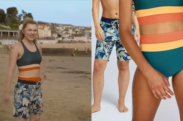 Darcy (Kizzy Edgell) jour sur la plage dans Heartstopper 3×01 avec un bikini Nani. Elle a enfilé par dessus un short à motif floral de la marque Animal.