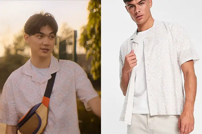 Tao (William Gao) porte cette jolie chemise avec cet imprimé géométrique dans Heartstopper 3×02.