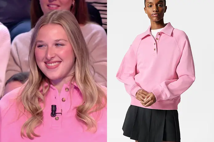 Héléna est venue s’amuser sur le plateau des Enfants de la télé (France 2) ce dimanche 13 avril et elle portait un sweat rose qui a attiré notre attention. Ce modèle à boutons pression dorés et col polo, à la fois décontracté et structuré, est une création signée & Other Stories.
