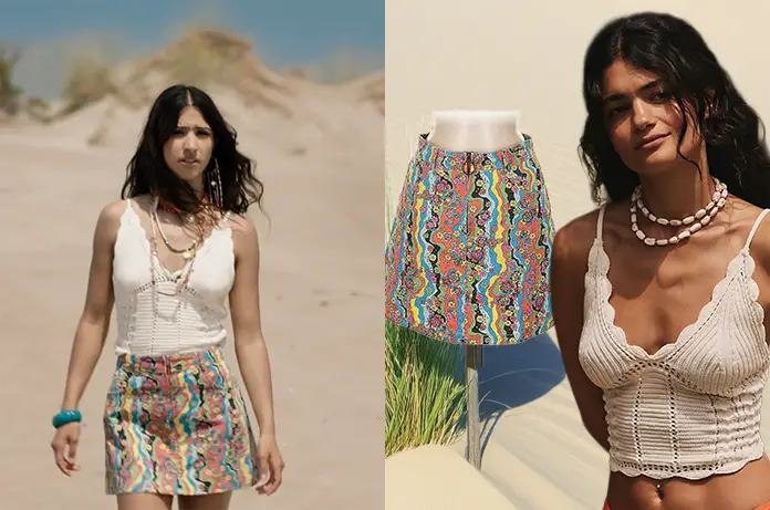 Elle porte une petite jupe multicolore de la marque Manoush.