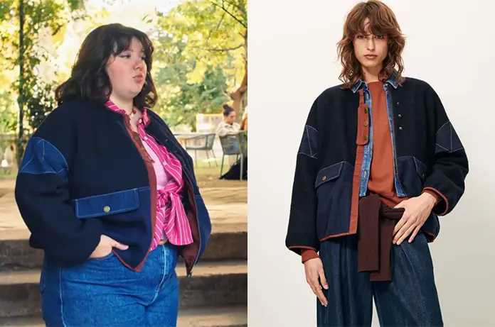 Coline (Talina Boyaci) a une nouvelle veste vraiment sympa pour l’automne, dans Ici tout commence épisode 1321. Elle est en laine bouillie avec des empiècements en denim et des surpiqures contrastées.
