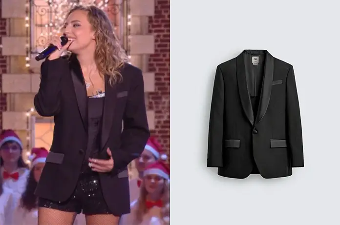 Elle portait un blazer noir de type smoking, sur un short à paillettes, noir également. Son top est de type corset, avec le dessus du bustier argenté.