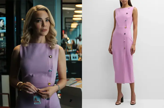Toujours dans les bureaux de sa rédaction, on la voit dans l’épisode 2, dans une robe lilas sans manches, structurée mais fluide, ornée d’une rangée de boutons multicolores en diagonale. Un modèle Lela Rose sold out.