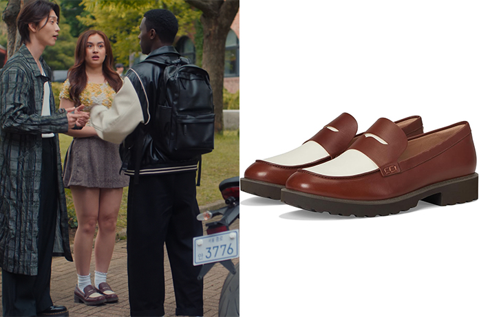 Pour parfaire sa silhouette, Kitty mise sur des accessoires de qualité, notamment ses chaussures : des Penny Loafers bicolores en cuir marron et blanc. Ce design deux tons est un clin d’œil vintage aux chaussures de golf et au style Ivy League. On les trouve ici
