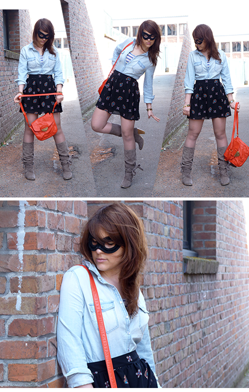 Bon je ne vais pas vous commenter la météo ... mais tout de même c'est plutôt cool de sortir du placard les jupes à volants face au vent ! Aujourd'hui j'ai opté pour un imprimé pierre précieuse, j'aime ce ptit côté décalé à contraster avec un look casual, avec ceci j'ajoute un top marinière et une chemise denim délavée, pour ajouter une touche vitaminée, j'ai opté pour un sac couleur orange vif et le tour est joué, vous aimez ?