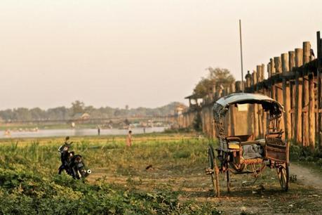 À Mandalay, une nouvelle fois beaucoup de temples étaient à voir ; cependant Lydia et moi souhaitions varier les plaisirs et sommes allés à Amarapura, une vingtaine de kilomètres au sud de la ville. Cette ville mérite un détour tout particulièrement pour l'interminable (1,2 km!) pont en teck permettant la traversée du lac Taungthaman, le U Bein bridge. Assis sur ses planches, le soleil s'est lentement couché au-dessus des pêcheurs et devant nos yeux, après avoir saisi quelques instants avec nos appareils photo. Un moment une nouvelle fois envoutant dont il faut profiter au plus vite, car ce lieu peut facilement devenir l'enfer de l'agoraphobie ! There were many temples to see in Mandalay but Lydia and I wanted to change a bit our visits. That is the reason why we headed to Amarapura, a township well-known thanks to its endless wooden bridge crossing the Taungthaman lake - the U Bein Bridge. We could assist to a wonderful sunset above the fishermen while we were sitting. it was another enchanting moment that I advise you to live as soon as possible because it could be very crowded soon.