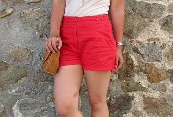 Aujourd’hui, tenue avec mon short rouge! Je vous l’avais déjà montré l’année dernière et cette année, je l’avais un peu délaissé. Et puis il est revenu dans mon cœur. Et j’ai eu envie de quelque chose de discret pour mettre l’accent sur le short.