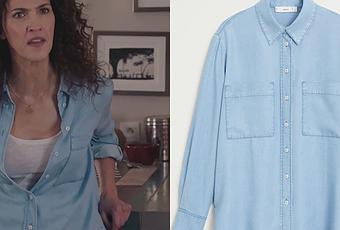 Clémentine (Linda Hardy) porte une chemise bleue avec de larges poches poitrine dans Demain nous appartient 913. De la marque Mango, on la trouvait ici