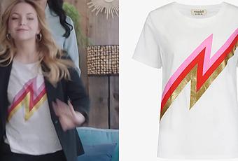 Judith (Alice Varela) portait un très sympathique t-shirt avec des éclairs de couleurs dans Demain nous appartient 925. De la marque Sugarhill Brighton, il semble épuisé