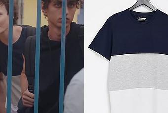 Jack (Dimitri Fouque) portait un t-shirt colorblock pour son arrivée à Sète dans Demain nous appartient 993. On le trouve ici