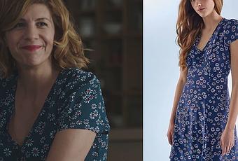 Sandrine (Juliette Tresanini) porte une robe bleue à fleurs très estivale dans Demain nous appartient 996. On la trouve ici.