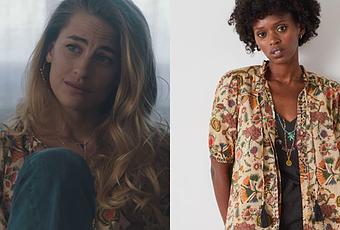 Victoire (Solène Hébert) porte une chemise d’été, très fleurie dans Demain nous appartient 996. Les manches sont courtes et deux pompons se baladent au bout du cordon à nouer.