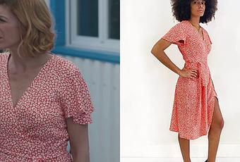 Sandrine (Juliette Tresanini) a choisi une robe très estivale, fond rouge fleurs blanches, et ne portefeuille pour annoncer son départ de Sète., dans Demain nous appartient 997. On trouve cette robe ici