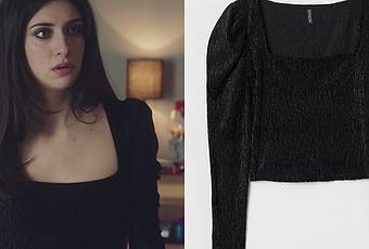 Célia (Rebecca Benhamour) porte un petit top noir côtelé avec des manches bouffantes dans Ici tout commence 325. Si l’article semble en rupture de stock sur H&M France, on en trouve encore sur H&M Belgique.