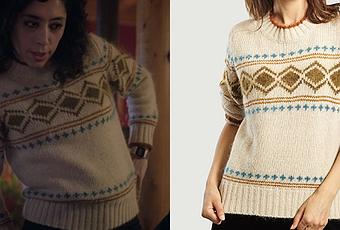 Sofia (Naidra Ayadi) quitte son domicile avec ce pull jacquard dans le premier épisode de Parallèles, sur Disney Plus.