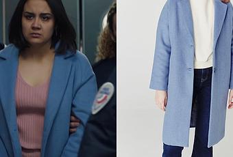 Noor (Sahelle de Figueiredo) porte les menottes dans Demain nous appartient 1132. Elle porte un manteau bleu d’hiver, avec deux boutons. On le trouve ici.