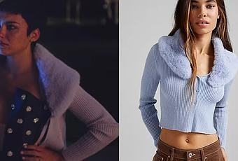 Ari (Carla Diaz) porte ce ravissant petit gilet bleu avec col fourré, dans Elite 5×07.On le trouve ici