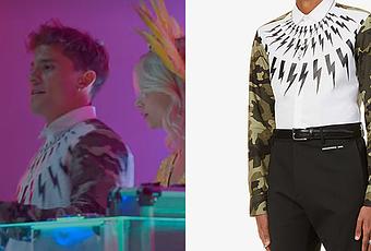 Iván Carvalho (André Lamoglia) se rend à Ibiza, dans Elite 5×07, dans une chemise avec des manches camouflage et un torse imprimé d’éclairs très emblématiques de Neil Barrett