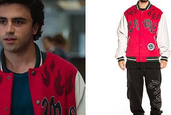 Samuel (Itzan Escamilla) revient au lycée dans Elite 5×06 dans ce bomber de la marque Grimey paré de flammes. On le trouve ici pour 60€