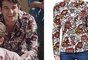 Tout comme Enzo ou Eliott, Greg (Mikaël Mittelstadt) peut choisir ses chemises au rayon filles… C’est le cas de cette chemise imprimée, vue dans Ici tout commence 416. On la trouve ici.