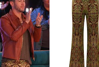 Nick Jonas porte un pantalon patte d’eph imprimé tapisserie dans Dancing with myself sur NBS. On le trouve ici ou ici