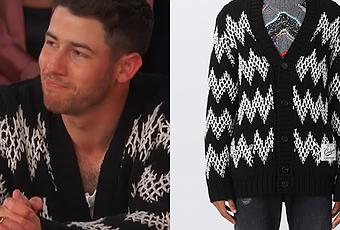 Dans le 5e épisode de Dancing with Myself (NBC), le juré Nick Jonas porte un gilet noir avec des motifs blancs. On le trouve ici