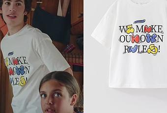 Pablo (Marius Blivet) part en vacances, dans Plus belle la vie 4576, avec un t-shirt blanc qui porte l’inscription « We make our own rules ». On le trouvait ici